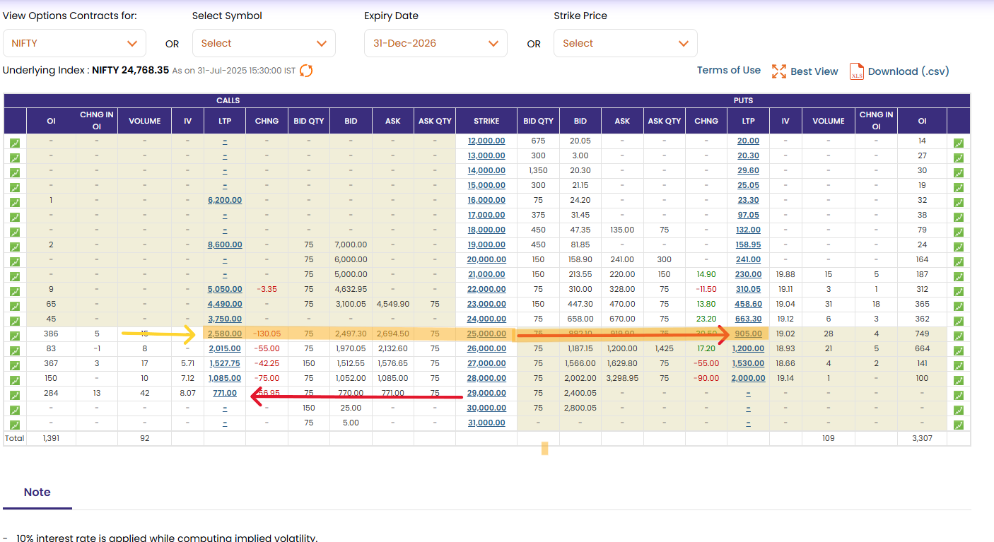 Below is the snapshot of Option chain taken on 31st July 2025. Just observe the price of CALL and PUT Option at Strike 25000, 29000.